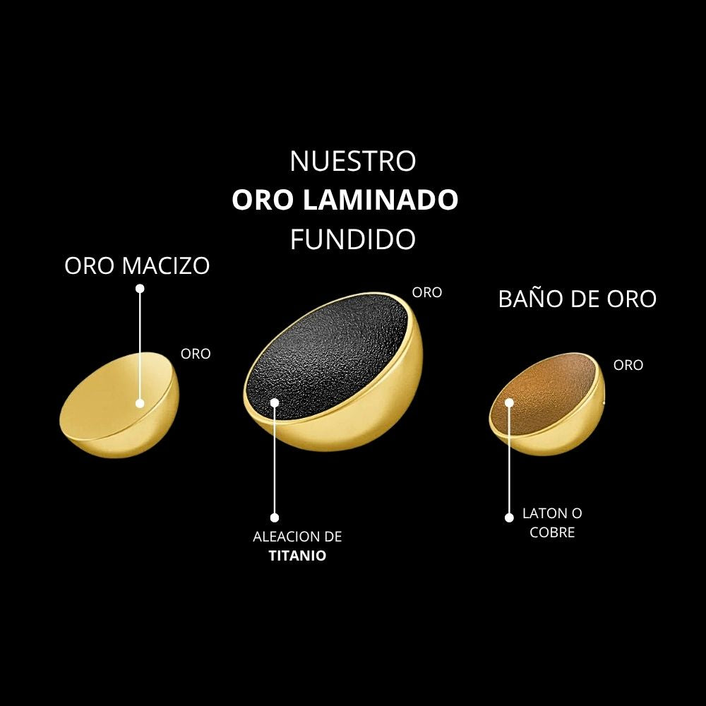 En Bravoro usamos una base de titanio recubierta con una lámina de oro de 18 quilates, lo que garantiza el mismo brillo, tono y apariencia del oro sólido. Este proceso no solo mantiene el lujo y la estética, sino que también ofrece mayor resistencia, ideal para el uso diario. ¡Lujo real, sin pagar una fortuna!